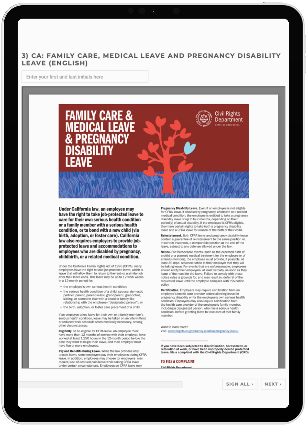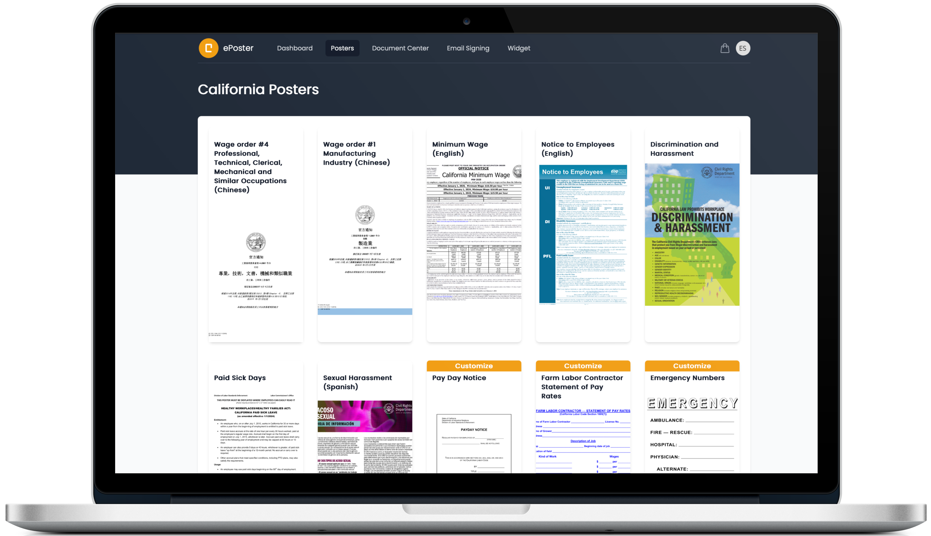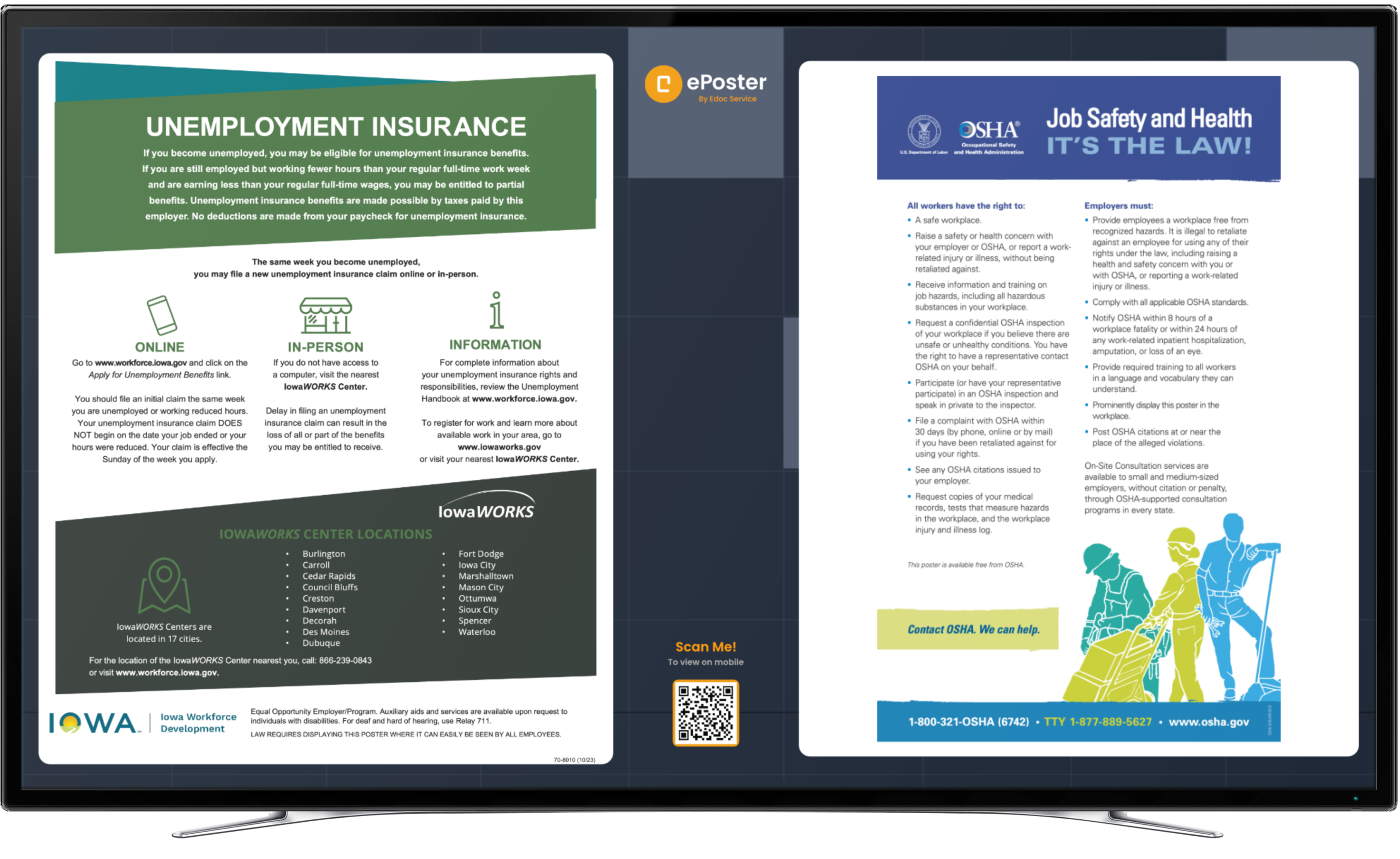 Upon subscription to our service, your compliance posters and additional features such as integration, email signing, breakroom screens, and more are available immediately for download and/or digital use.